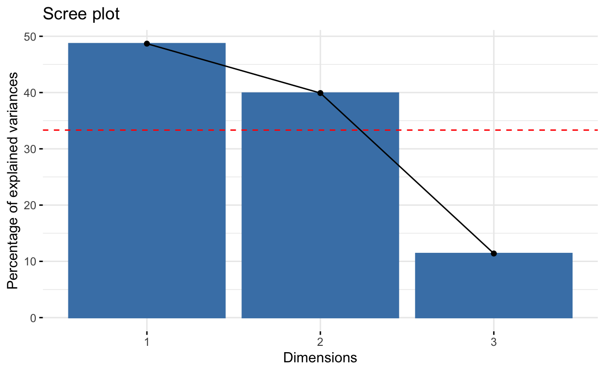 El código R a continuación, dibuja el gráfico de pantalla con una línea discontinua roja que especifica el valor propio promedio: