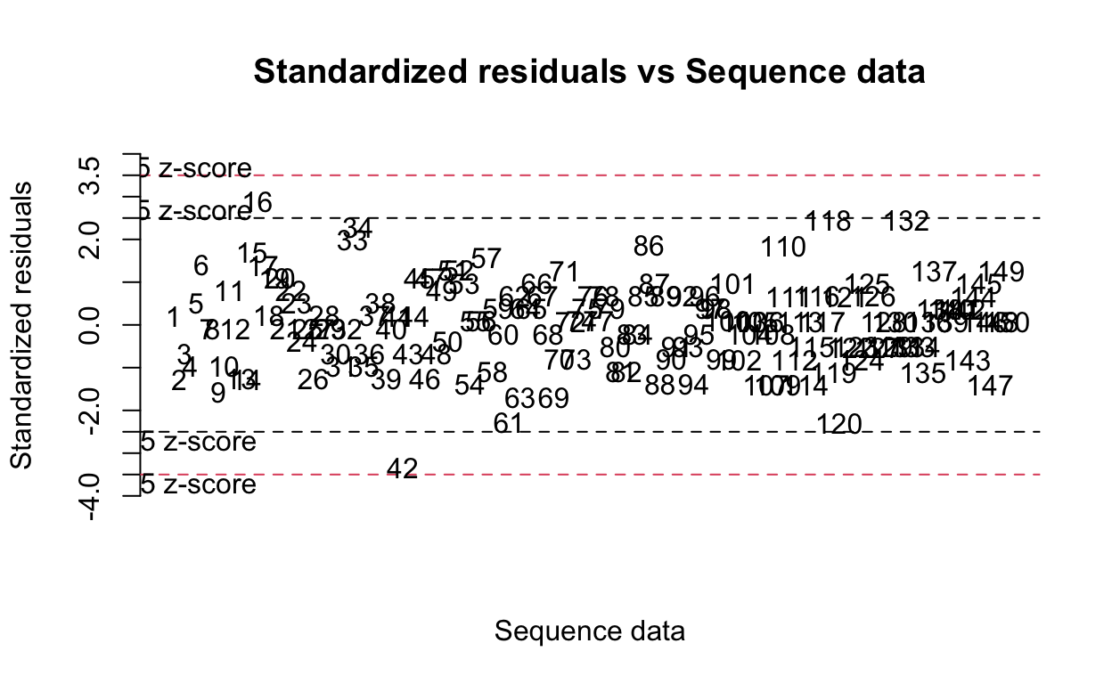 El supuesto de independencia se verifica con mayor frecuencia con base en el diseño del experimento y en el buen control de las condiciones experimentales, como es el caso aquí. Sin embargo, si realmente desea probarlo de manera más formal, puede probarlo mediante una prueba estadística: la prueba de Durbin-Watson (en R: durbinWatsonTest(res_lm) donde res_lm es un modelo lineal). La hipótesis nula de esta prueba especifica un coeficiente de autocorrelación = 0, mientras que la hipótesis alternativa especifica un coeficiente de autocorrelación ≠ 0.