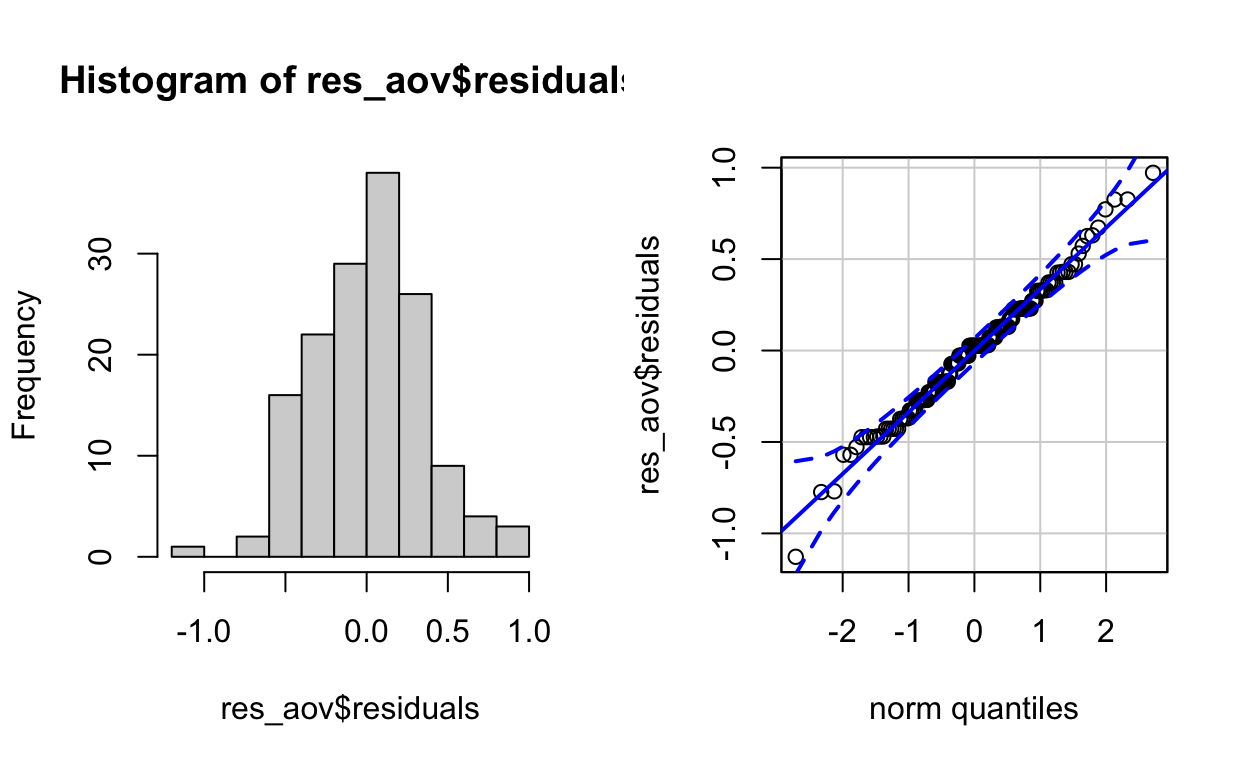Recuerde que la normalidad de los residuos se puede probar visualmente mediante un histograma y un gráfico QQ, y/o formalmente mediante una prueba de normalidad (prueba de Shapiro-Wilk, por ejemplo).